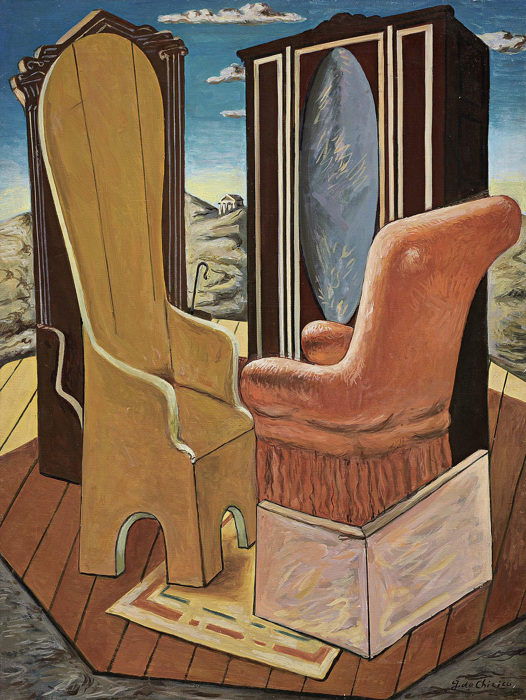 Giorgio de Chirico Volos 1888 - Roma 1978 Mobili nella valle, 1963 Olio su...