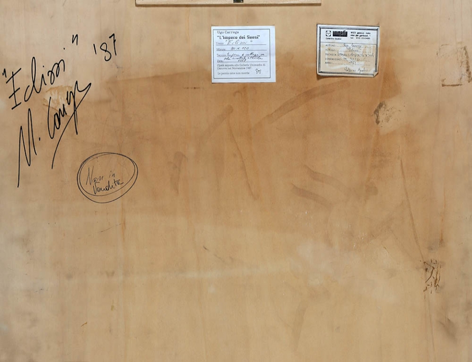 UGO CARREGA 1935 " Eclissi ", 1987 Tempera e collage su tela su tavola, cm. 120 x 80 Firmato e datato sul retro Etichetta Galleria Unimedia, Genova sul retro Prov. Collezione Privata