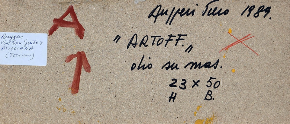 PIERO RUGGERI 1930 - 2009 " Artoff ", 1989 Olio su tavola, cm. 23 x 50 Firmato e datato sul retro Prov. Collezione Privata