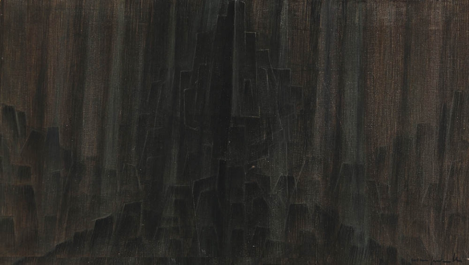 CESARE PEVERELLI 1922 - 2000 Senza titolo, anni 50 Tecnica mista su tela, cm. 45 x 80 Firmato in basso a destra Opera presenta un taglio in alto a sinistra Prov. Collezione Privata