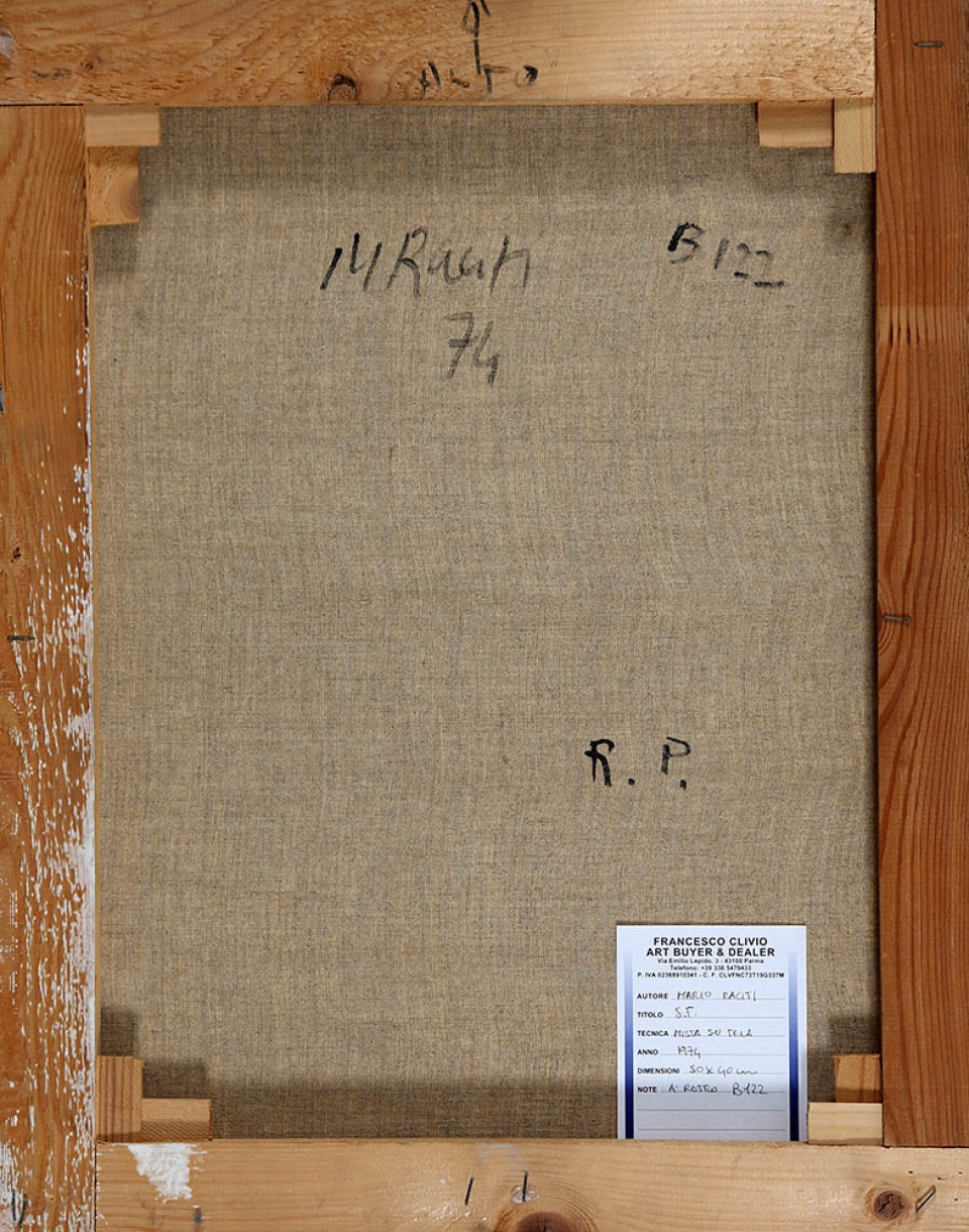 MARIO RACITI 1934 Senza titolo, 1974 Tecnica mista su tela, cm. 50 x 40 Firmato e datato sul retro Etichetta Francesco Clivio Arte, Parma sul retro Prov. Collezione Privata