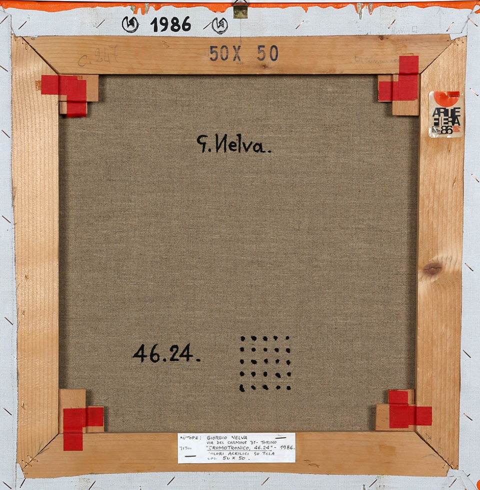 GIORGIO NELVA 1940 " Cromotronico 46.24 ", 1986 Acrilico su tela, cm. 50 x 50 Firmato e datato sul retro Autentica dell'artista su fotografia BIBLIOGRAFIA: " Generazione Anni Quaranta, tomo II ", Edizioni Bora, 2009, tav. 1405 Prov. Collezione Privata