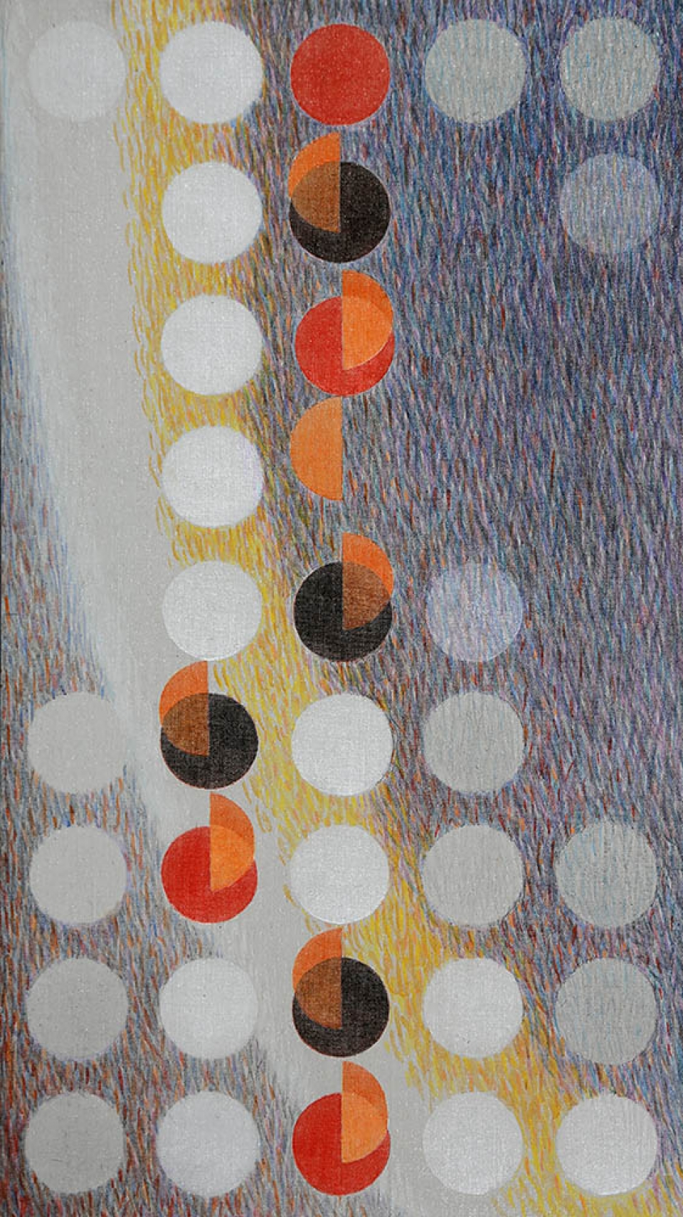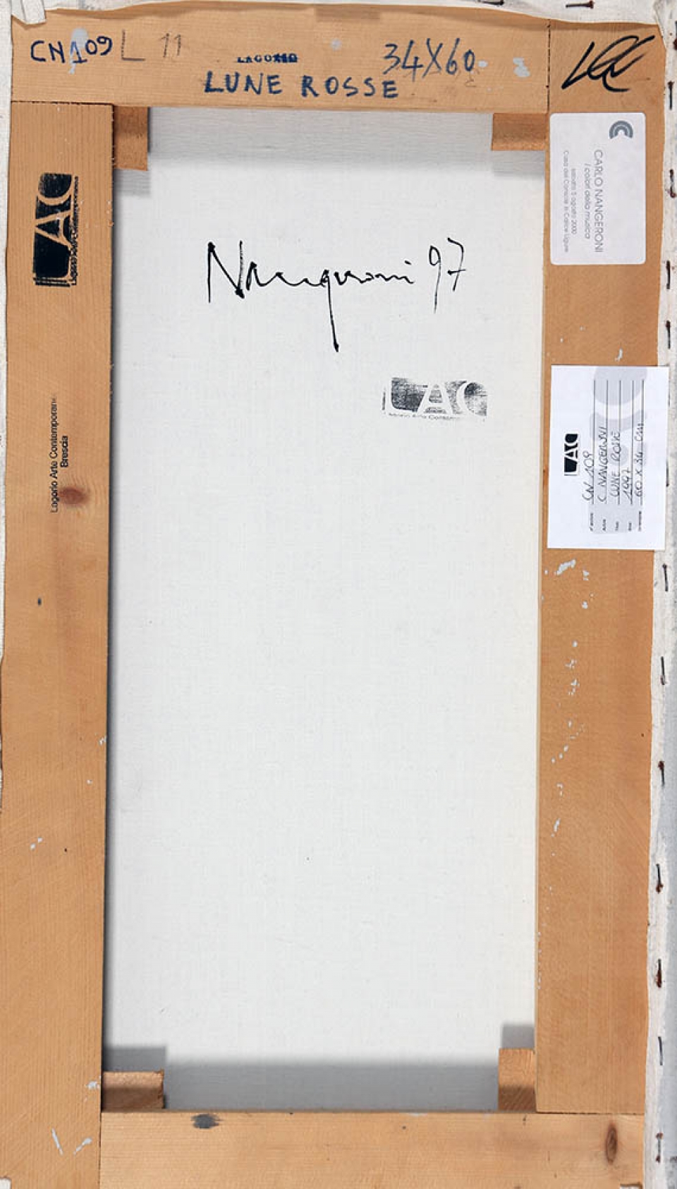 CARLO NANGERONI 1922 " Lune rosse ", 1997 Tecnica mista su tela, cm. 60 x 34 Firmato e datato sul retro Etichetta Lagorio Arte, Brescia sul retro Etichetta Mostra Carlo Nangeroni, Casa del Console Calice Ligure sul retro Prov. Collezione Privata