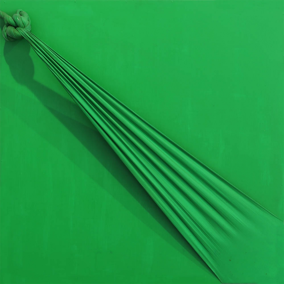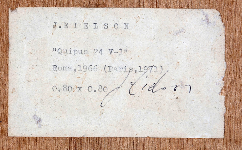JORGE EIELSON 1924 - 2006 " Quipus 24 V - 1 ", Roma 1968, (Parigi 1971) Tela con nodo su tavola, cm. 80 x 80 Firmato e datato sul retro Autentica Archivio Eielson Il Chiostro Arte, Saronno su fotografia Prov. Collezione Privata