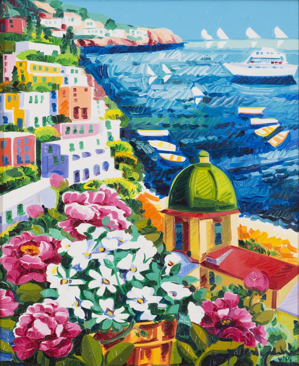 Athos Faccincani (1951) Luce sulle peonie e Positano Firmato A. Faccincani sul retro Olio su tela cm 60x50 Eseguito nel 2009 Titolo sul retro Fotografia dell'opera autenticata dall'artista