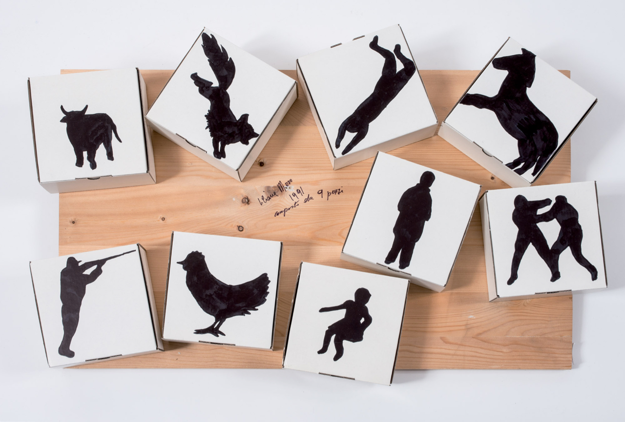 Liliana Moro (1961) Senza titolo Firmato e datato Liliana Moro 1991 al centro Assemblaggio di 9 scatole con disegni a pennarello su tavola di cm 50x70x7 (opera) - cm 14x14x5,5 (ciascuna scatola) Eseguito nel 1991 Fotografia dell'opera autenticata dall'artista