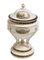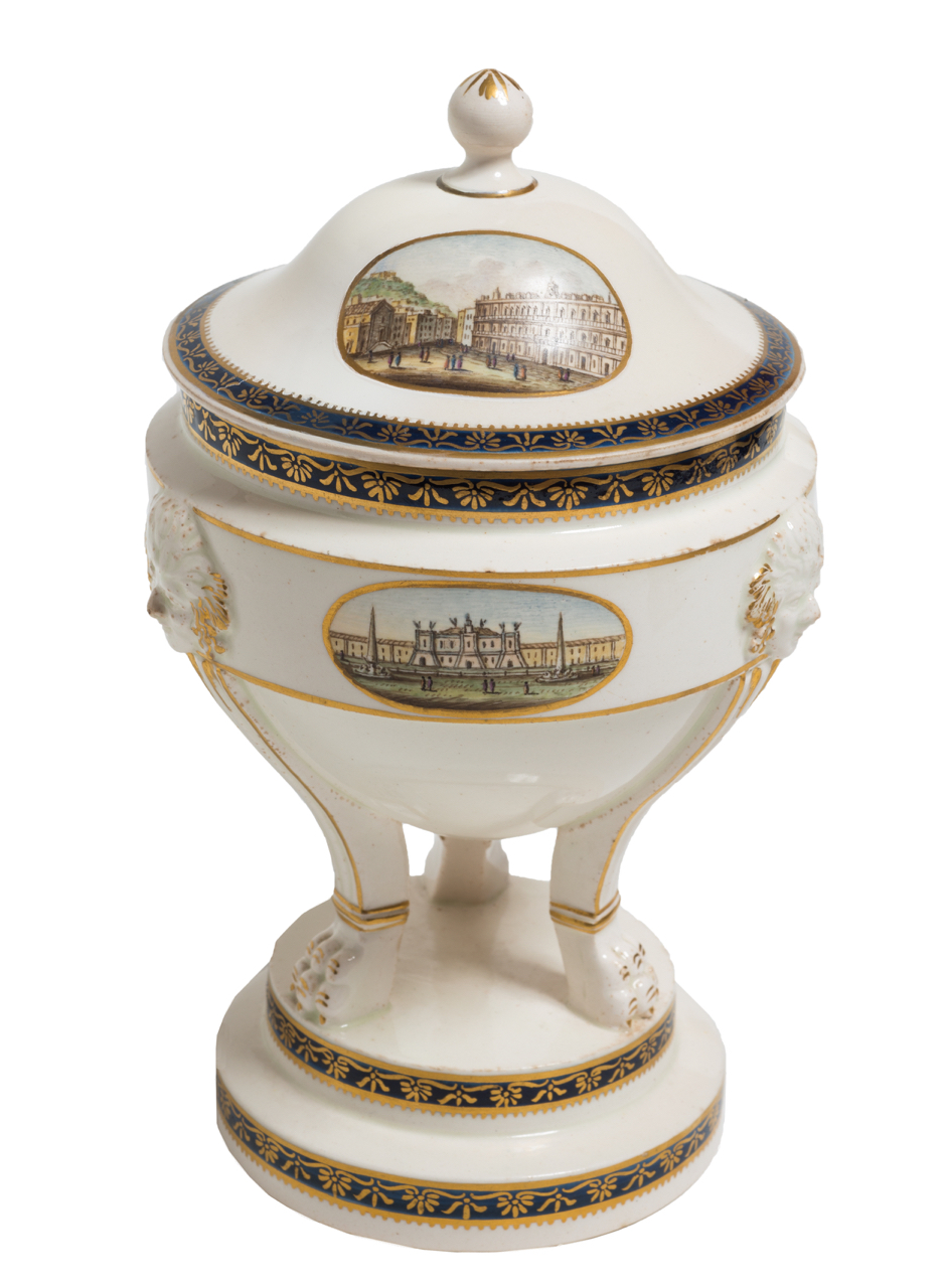 Zuppierina con coperchio in terraglia policroma con decori blu ed oro sulle fasce, ed edicole dipinte sul coperchio e sul corpo della zuppiera raffiguranti: il Real Palazzo di Napoli, Palazzo dei Reggi Studij, sul coperchio; Real Casino di Pausilipo, Real Casino di Cardito e Real Casino di Fusaro, sul corpo. Fabbrica Migliuolo Giustinani Napoli, 1825 ca marchio sul fondo h cm 24, piccolo restauro sul coperchio