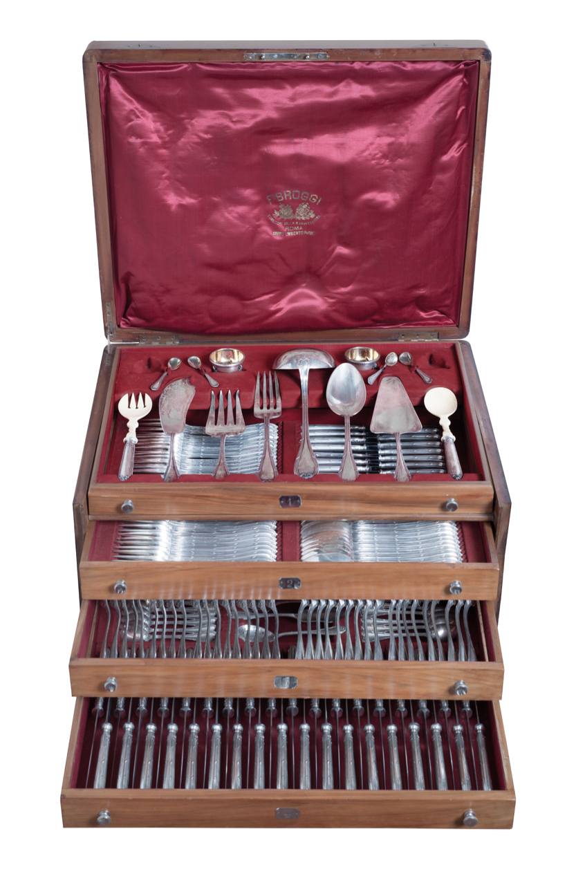 Servizio di posate in argento e argento vermeillecorredato da un' elegante cassetta in legno di mogano con quattro cassettini estraibili, un'anta "abatant" e due maniglie laterali per il trasporto; composto da: