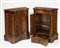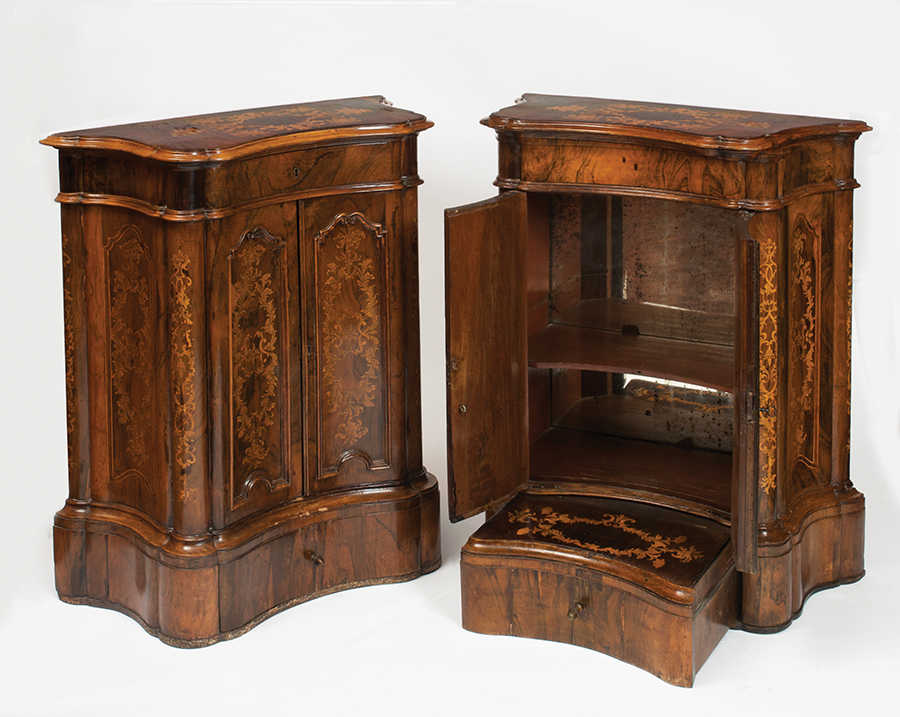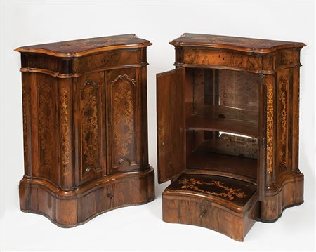 Coppia di mobiletti con pianetto inginocchiatoio di linea mossa interamente intarsiata a motivi fitoformi, due ante anteriori con cornici mosse che racchiudono intarsi come nei laterali, un cassetto centrale frontale