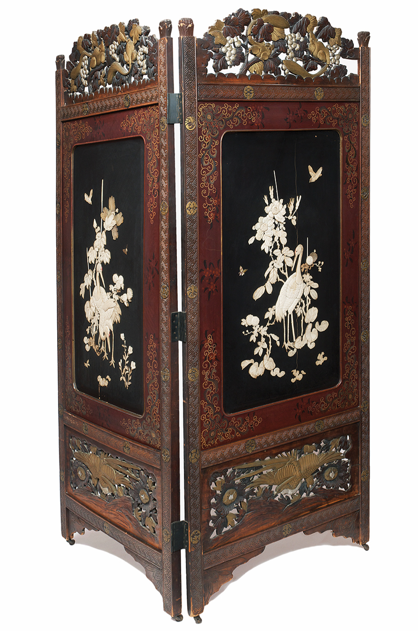Separè a due ante con pannelli dipinti in policromia e oro e con sovrapposizioni in avorio e madreperla