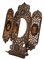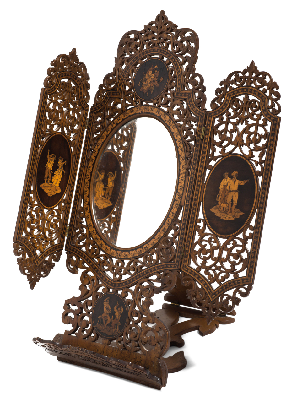 Specchiera sorrentina d' appoggio in olivo, con placchette inserite nel traforo raffiguranti scene popolari intarsiata e traforata fine XIX- inizio XX secolo cm 47x38 (apertura totale) disincernierata, lieve mancanza di parte traforata