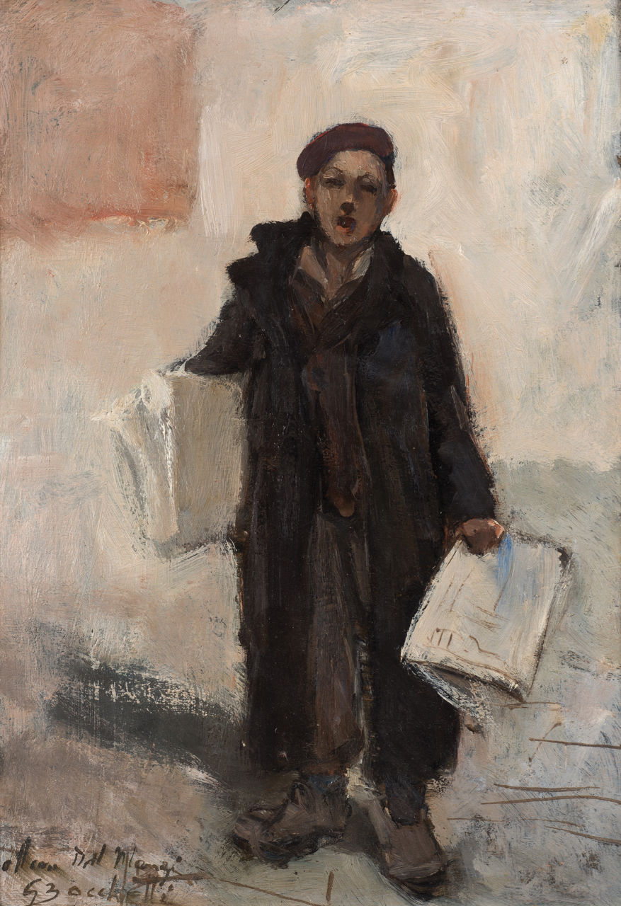 Gaetano Bocchetti (Napoli, 1888 - 1990) Il venditore di giornali olio su tavola, cm 31x22 firma e dedica in basso a sinistra