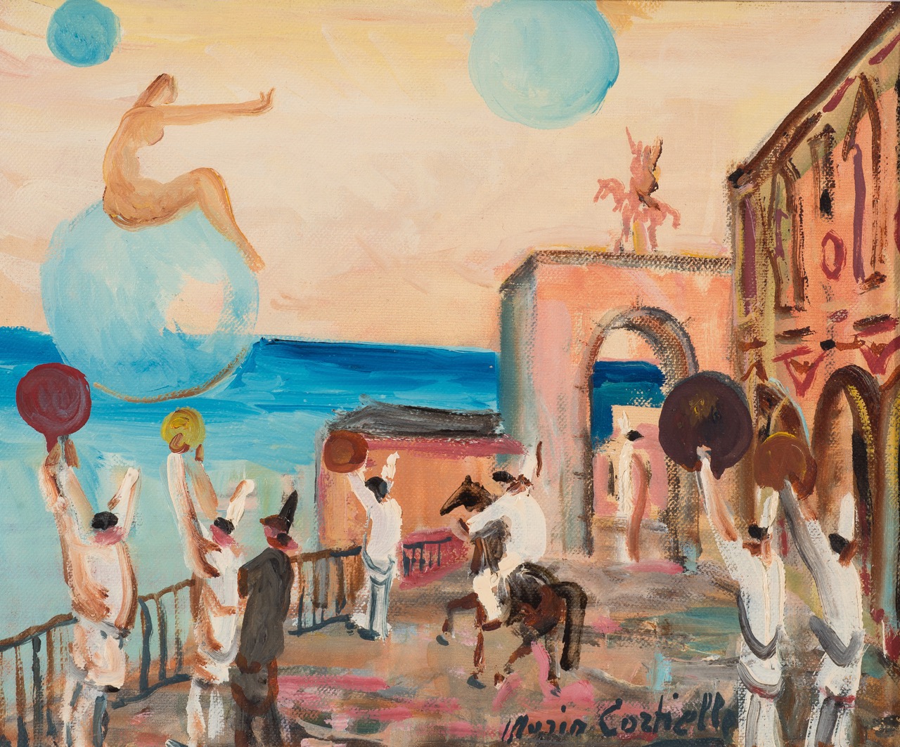 Mario Cortiello (Napoli, 1907 – San Sebastiano al Vesuvio, 1981) Atterraggio di Venere olio su tela, cm 24x30 firmato Mario Cortiello in basso a destra