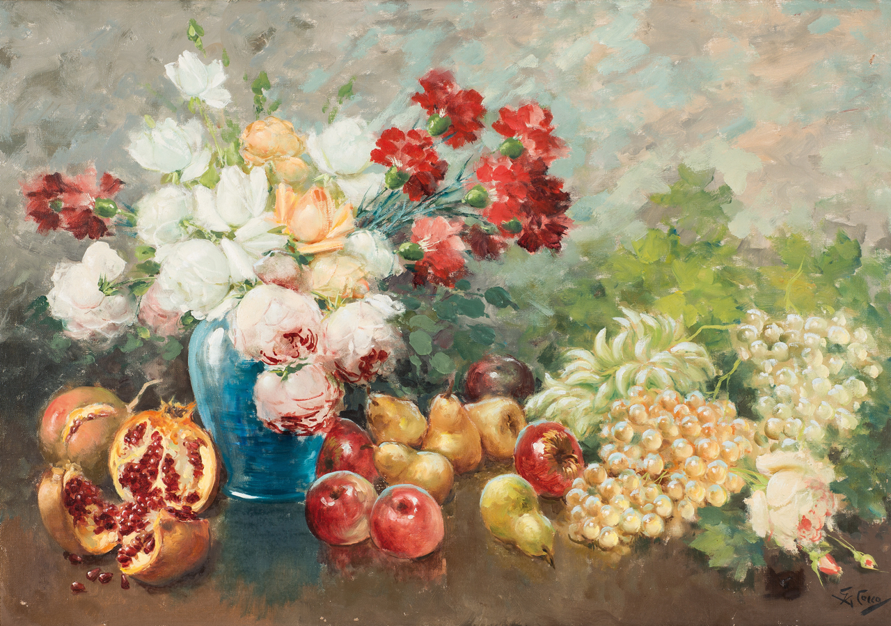 Giuseppe Alberto Cocco (Chieti, 1879 - Napoli, 1963) Fiori e frutti su un piano olio su tela, cm 70x100 firmato G. Cocco in basso a destra