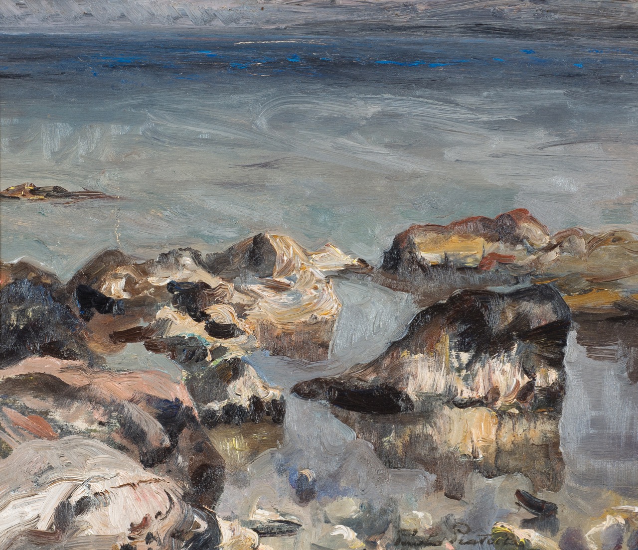 Fausto Pratella (Napoli, 1888-1946) Scogli olio su tavola, cm 27x33 firmato Fausto Pratella in basso a destra