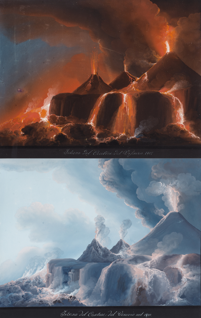 attribuito a Camillo De Vito ( attivo a Napoli tra il 1790 e il 1845) coppia di gouaches su carta, cm 40x50 cad. a) Studio della colata lavica all'interno del cratere durante l'eruzione notturna del Vesuvio del 1822 b) Studio della colata lavica all'interno del cratere durante l'eruzione diurna del Vesuvio del 1822