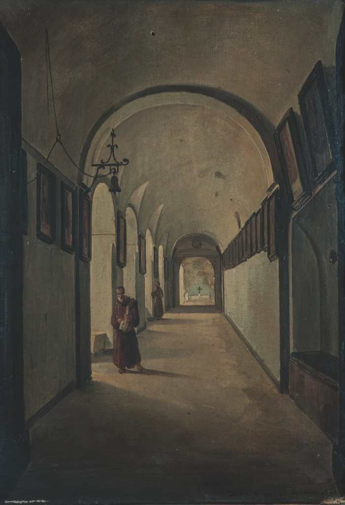 Frans Vervloet (Malines, 1795 - Venezia, 1872) Chiostro del convento dei Cappuccini a Sorrento olio su tela, cm 32x23,5 firmato e datato "F. Vervloet Sorento 184" in basso a destra