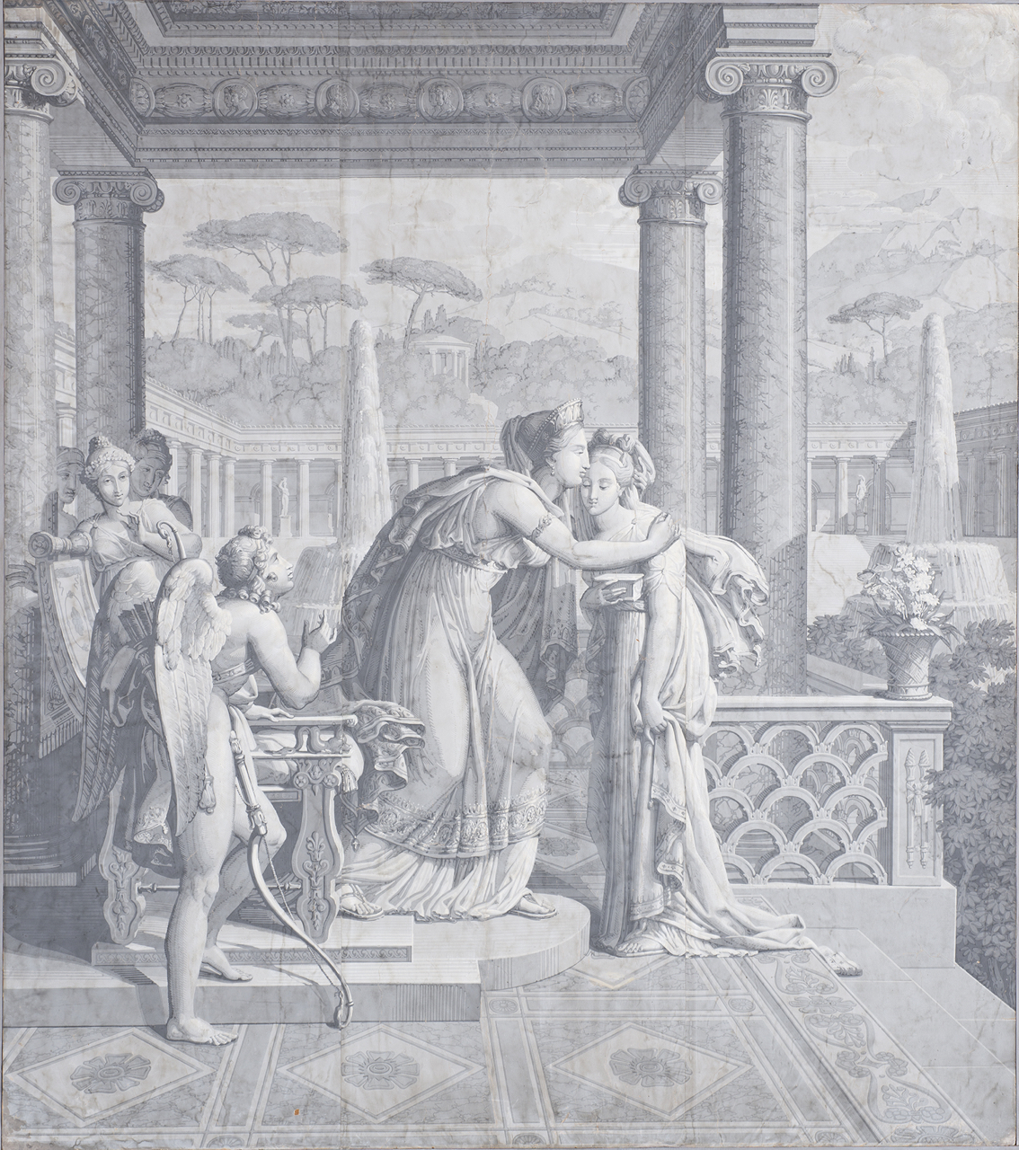 Merry Joseph Blondel - Louis Lafitte Merry-Joseph Blondel ( 1781-1853), Louis Lafitte (Paris, 1770-1828) La riconciliazione di Venere e Psyche grisaglia su carta applicata su pannello, cm 180 x159 Bibliografia: E.A. Entwistle, French Scenic Wallpapers 1800-1860, F. Lewis, Leigh on Sea, 1972, pl.20-24. Il pannello fa parte della serie eseguita nel 1815 da Merry- Joseph Blondel e Louis Lafitte per la manifattura Dufour. foto La serie comprendeva ventisei elementi, tutti direttamente ispirati al poema "Les Amours de Psyche et de Cupidon" di Jean de La Fontaine del 1669. Precedentemente, il romanzo di Cupido e Psyche fu pubblicato per la prima volta nel II secolo d.c. da Apuleio, nell' "Asino d'oro". La serie venne esposta nel 1819 a l'Exposition des Produits de l'industrie dove vinse la medaglia d'argento. Altri esemplari della stessa serie sono stati esposti al Deutsches Tapetenmuseum, Kassel, Germania e alla Whitworth Art Gallery, Manchester. Tra i vari pannelli della serie Psyche e Cupido, un set di quattordici grisaille su carta è stato venduto da Christie's, London, 15 Dicembre 1994, lotto 363 (£ 20,600 con premium), mentre un set di cinque è stato venduto più recentemente, Sotheby's, London, 4 Dicembre 2007, lotto 81 (£50,900 con premium).