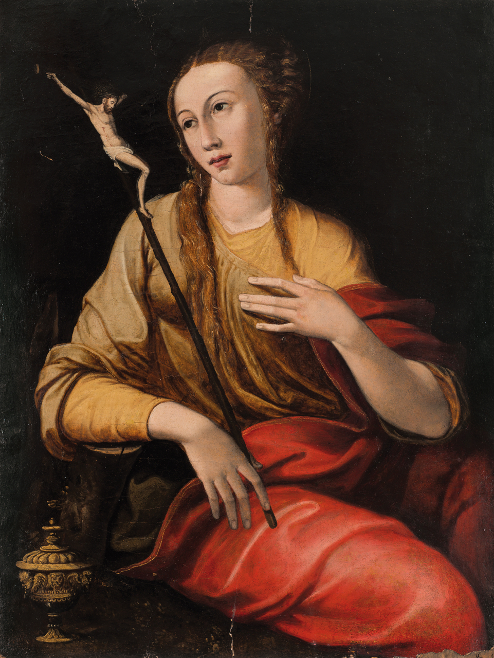 Scuola toscana, metà del XVI secolo Maddalena Penitente olio su tavola, cm 99x75,6 Dipinta su tavola, questa raffigurazione della Maddalena rivela immediatamente la sua origine stilistica cinquecentesca e centro-italiana sia dalle forme allungate e scultoree che dall'elegante rapporto tra i colori accesi e brillanti e le esili forme anatomiche, sottolineate dai raffinati panneggi. Il professor Alessandro Nesi, che ha studiato il dipinto, ha proposto foto l'attribuzione a Leonardo Grazia, detto Leonardo da Pistoia. Lo studioso, in una scheda critica redatta a dicembre 2014, basa la sua analisi attributiva su accostamenti formali, narrativi e stilistici che lo indirizzano ad inserire il dipinto nella produzione dell'artista pistoiese. Nesi accosta la Maddalena con un' ampia serie di dipinti dedicati ad eroine del mondo antico come Lucrezia e Cleopatra. Tra esse la ‘Lucrezia’, le due versioni di ‘Venere’ e la ‘Cleopatra’ , tutte a Roma , Galleria Borghese; e la ‘Venere e Cupido’ a Napoli, Gallerie di Capodimonte. Vengono inoltre evidenziate le affinità con la Cleopatra a Troyes, Musee desBeaux-Arts e quella recentemente venduta in asta ( Napoli, asta Blindarte n.69- 30 novembre 2014, lotto n 99) Cf: A. Nesi, Leonardo Grazia e Benedetto Pagni: echi dello stile di Giulio Romano tra Pistoia e Pescia, in " Arte Cristiana", XCIII, 2005, p.183; P. Leone de Castris, Pittura del Cinquecento a Napoli 1540-1573, cit., pp. 85-107; 331-332).