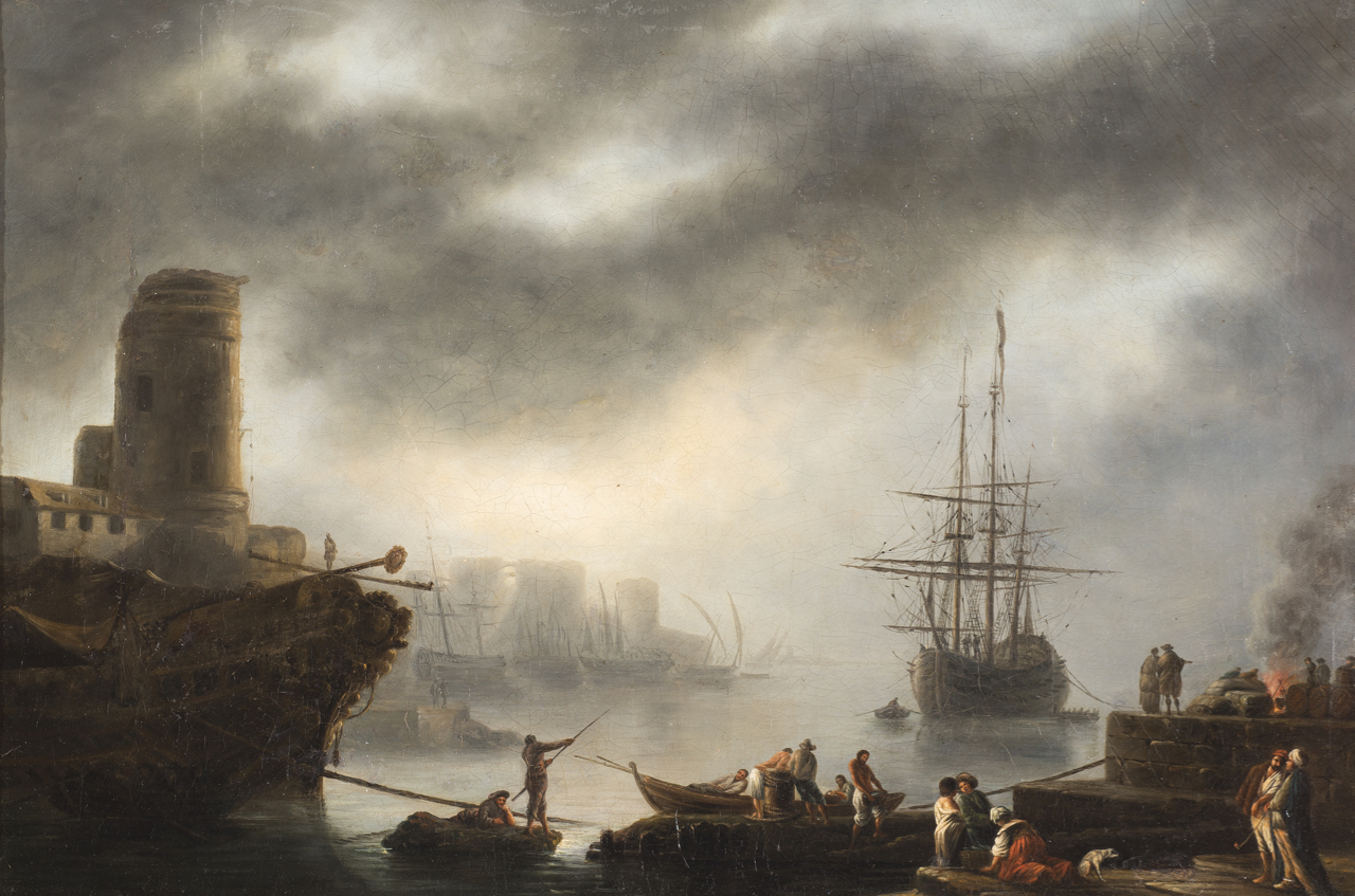 cerchia di Charles Francois Grenier de Lacroix, detto Lacroix de (Francia, 1700-1782) Astanti sul molo di un porto mediterraneo olio su tela, cm 54x81