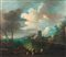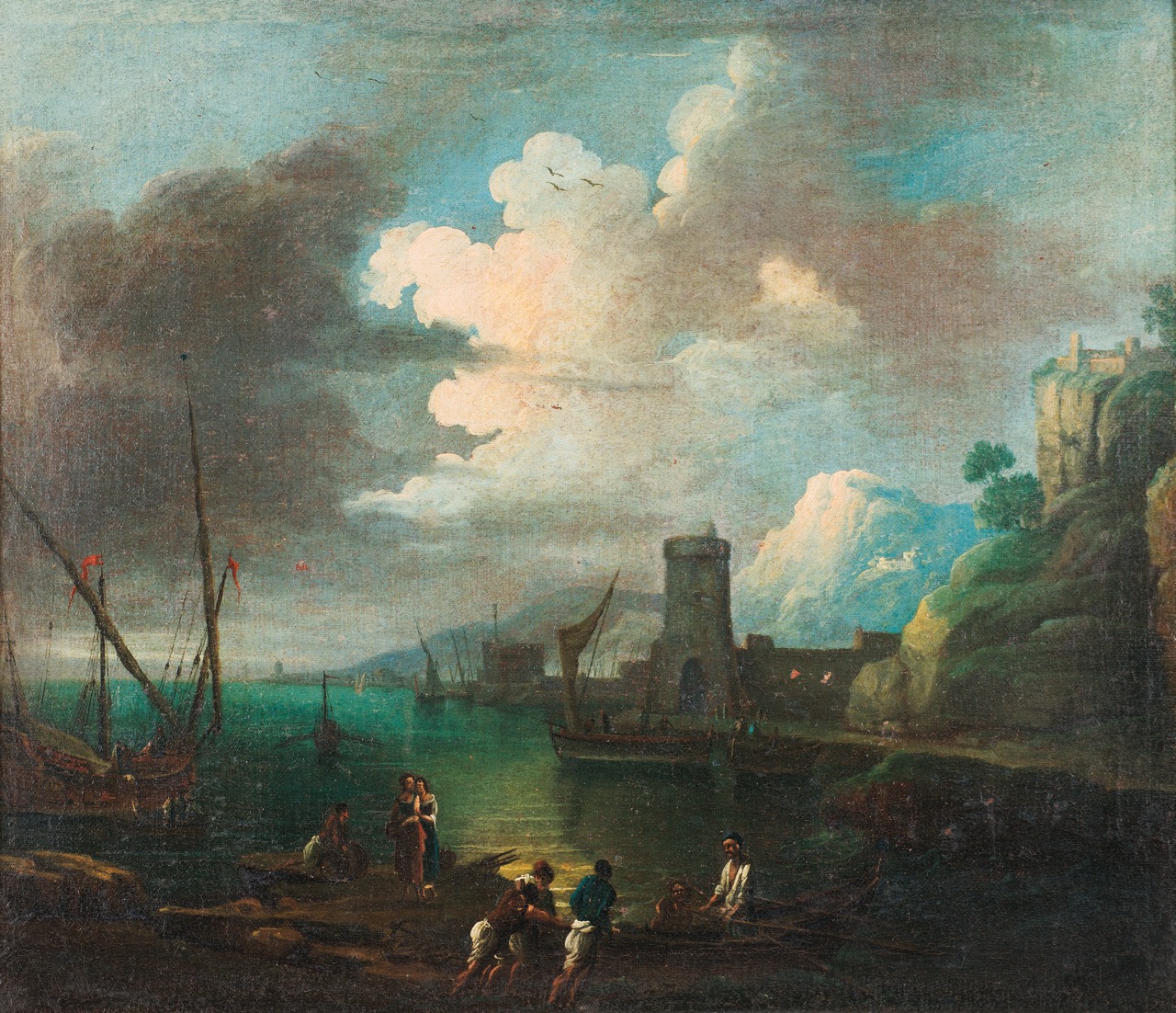 Scuola veneta, prima metà del XVIII secolo Marina mediterranea con astanti e velieri e una cima innevata sullo olio su tela, cm 63x78 Per il presente dipinto è stata avanzata anche un'attribuzione ad Antonio Stohm