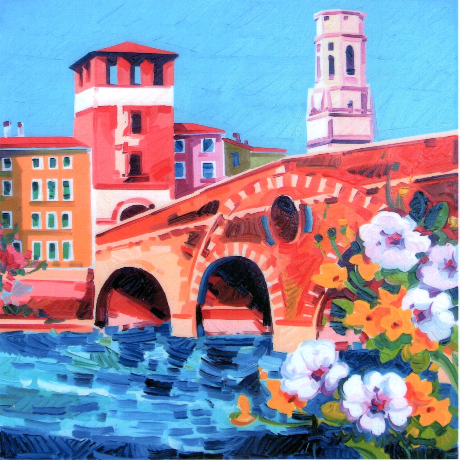 Athos Faccincani. "Ponte pietra e riflessi".2010 Olio su tela cm 40x40.Firma in basso a destra con autentica su foto dell'Artista