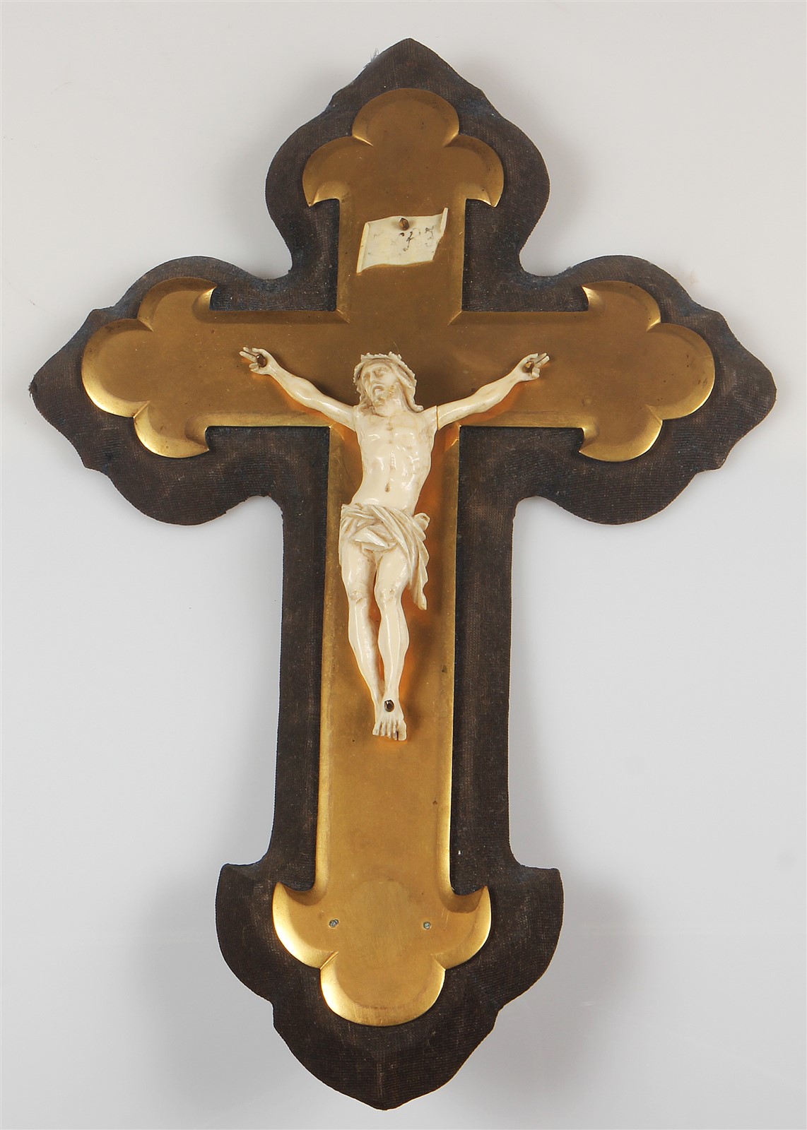 ARTISTA DEL XVIII SECOLO Cristo in avorio con croce in metallo. Avorio e...