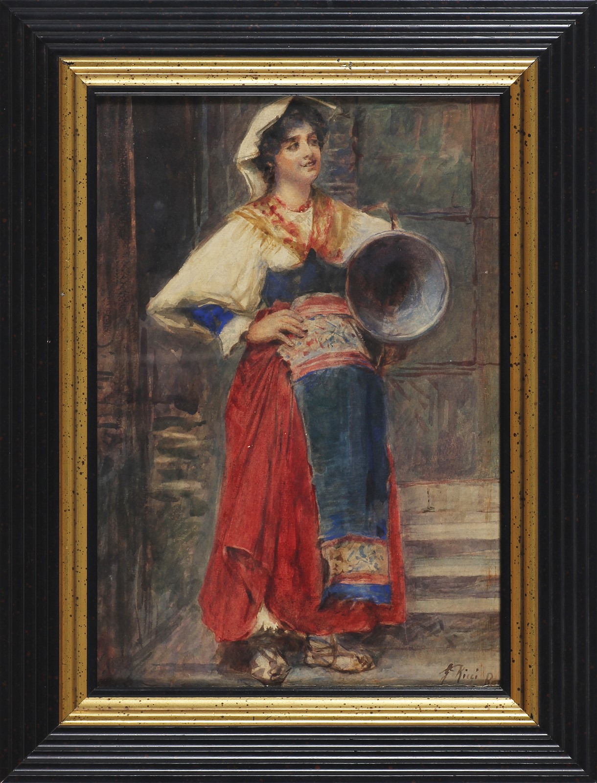 PITTORE ITALIANO DEL XIX SECOLO Popolana. Acquerello su carta. Cm 25,00 x 36,00. Firma in basso a destra: G. Ricci, Roma. Cornice presente