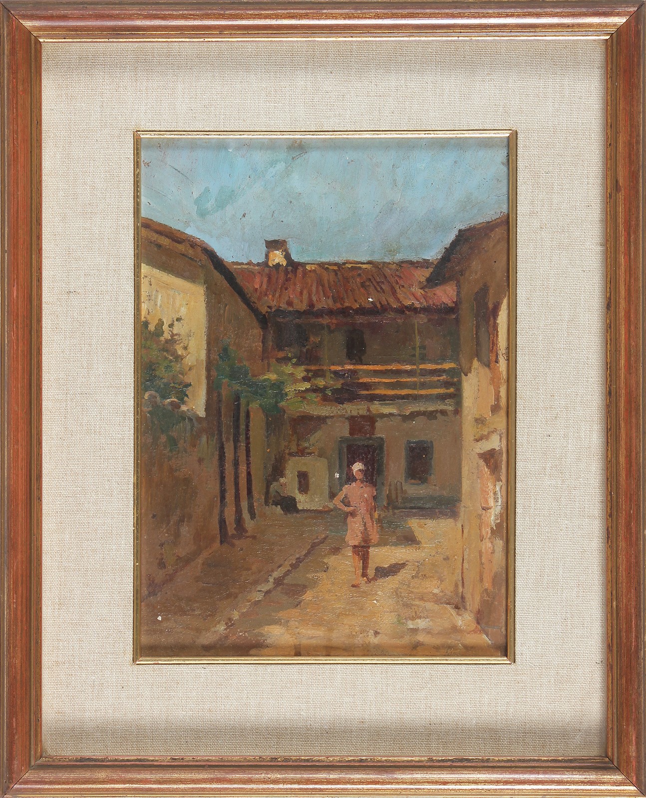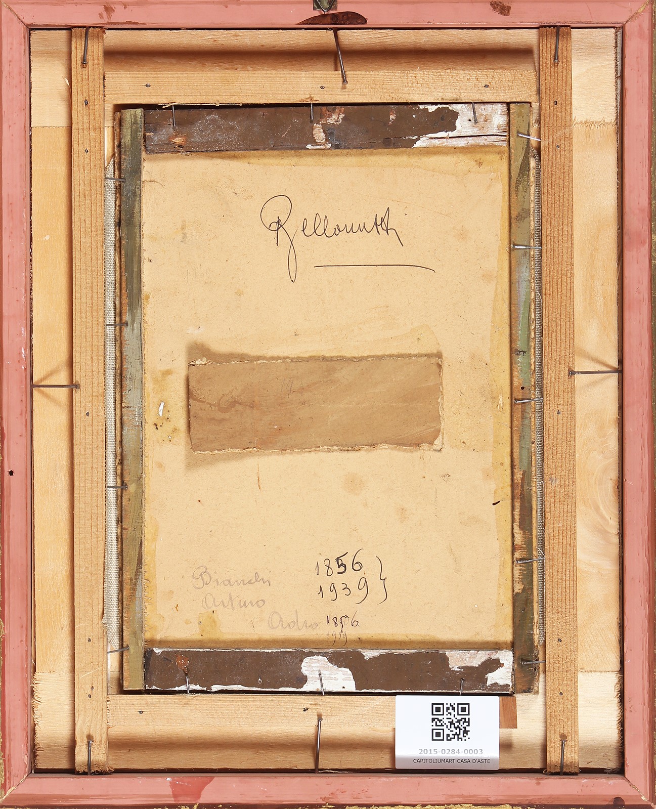 BIANCHI ARTURO (1856 - 1939) Cascina con ragazza. Olio su cartoncino. Cm 21,00 x 30,00. Pubblicato in: Arturo Bianchi, Paesaggi, figure, impressioni, 1856-1839, fig. 309, pagina 247.