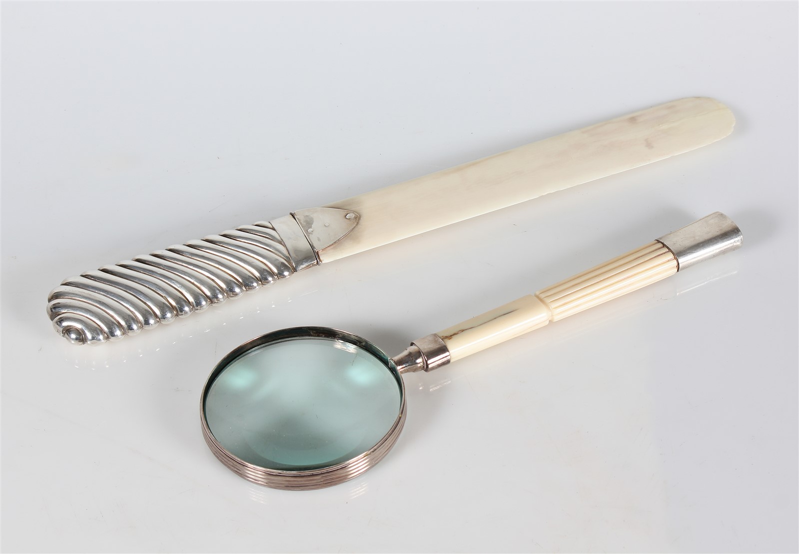 MANIFATTURA DEL XIX SECOLO Tagliacarte e lente. osso e argento. . Dimensioni tagliacarte: 40x55.5 cm; lente 31.5x10 cm.