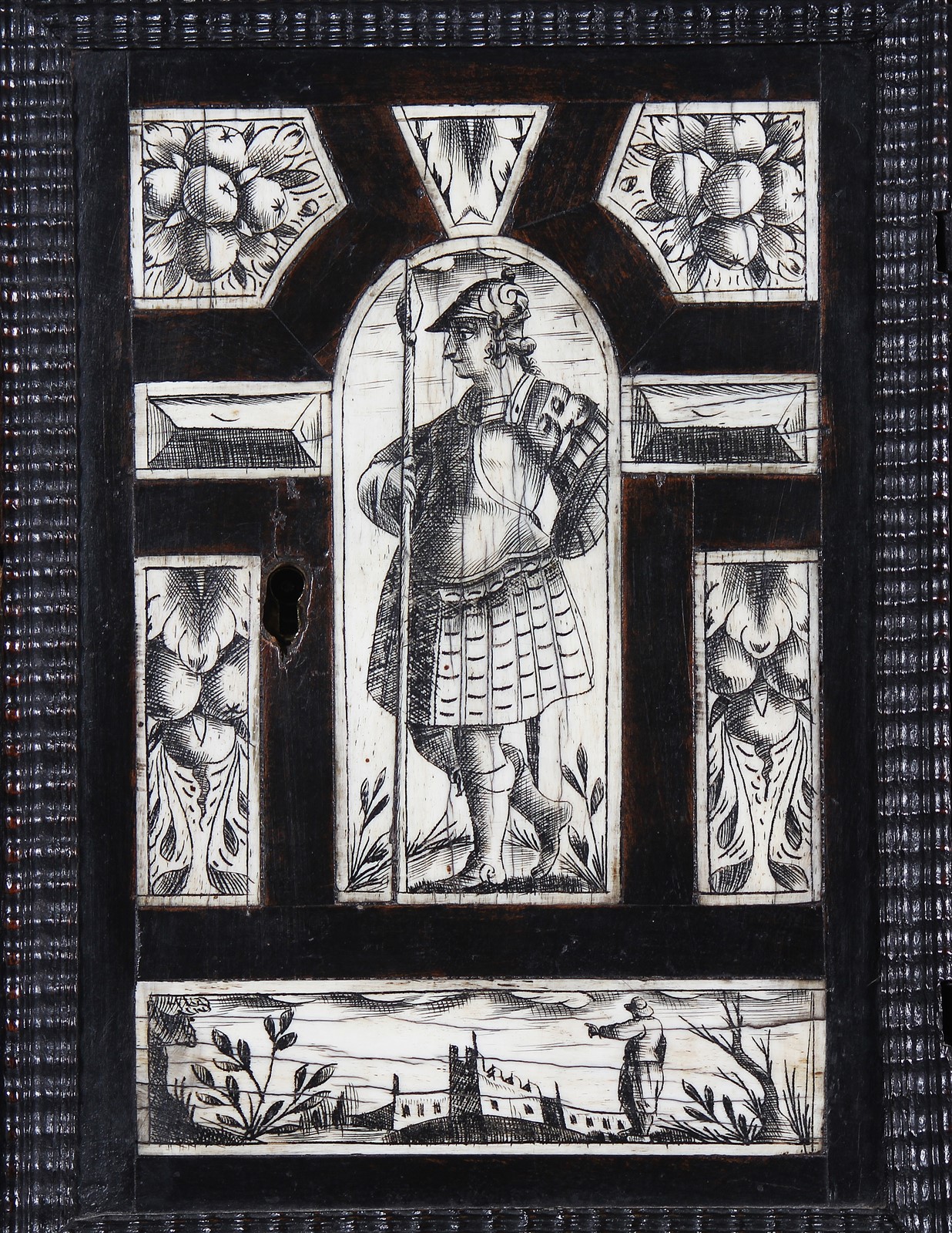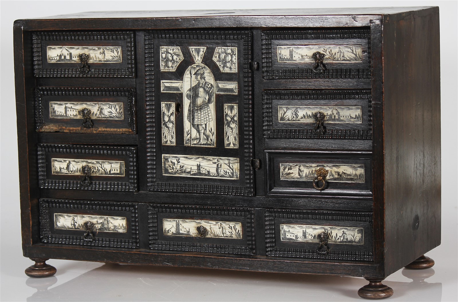 MANIFATTURA LOMBARDA DEL XVIII SECOLO Monetiere. Legno ebanizzato e avorio. Cm 43,00 x 65,00 x 30,00. le formelle che decorano i cassetti sono in osso raffiguranti motivi paesaggistici e floreali. Presenta piccole mancanze e diffetti.