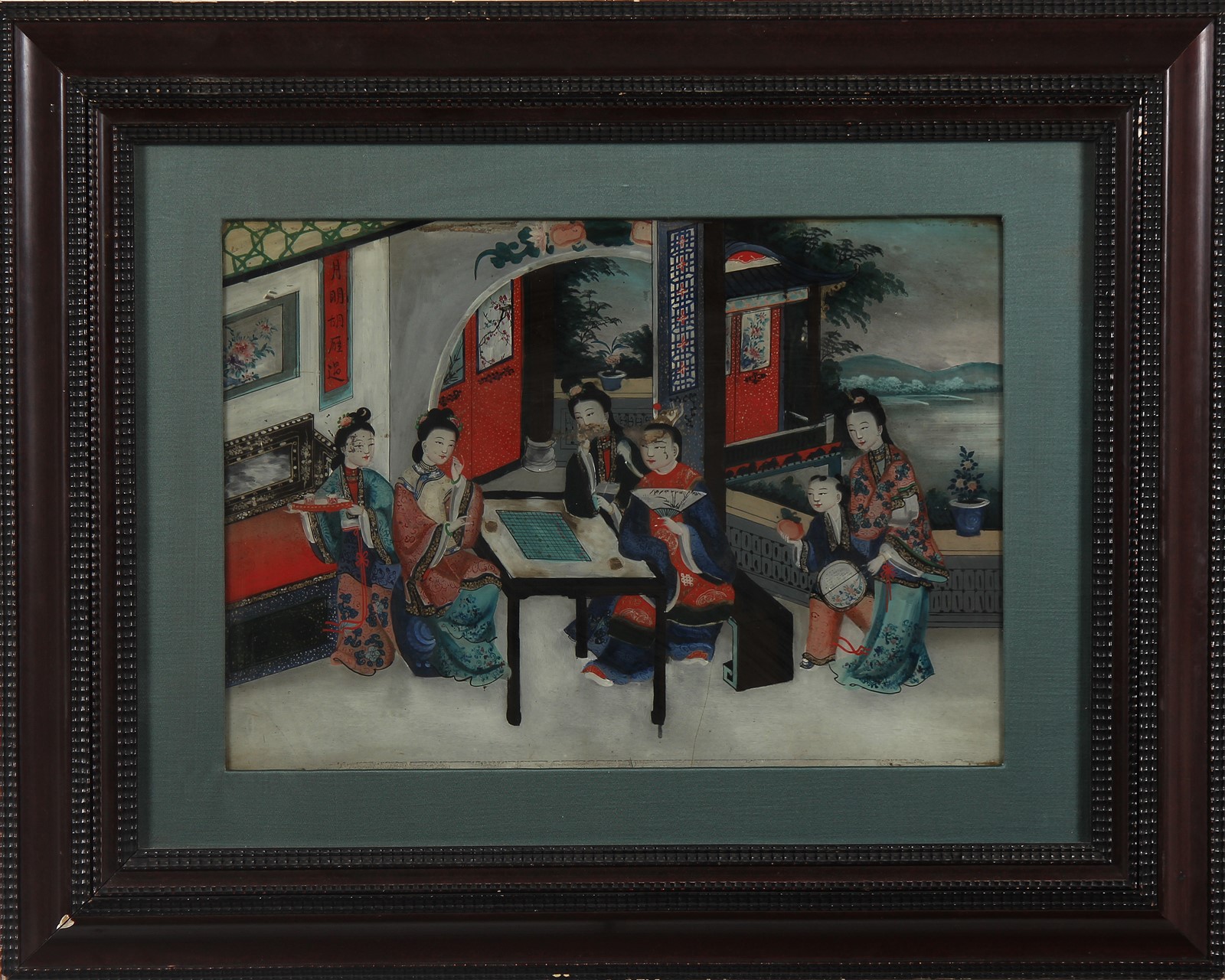 PITTORE CINESE DEL XIX SECOLO Scena d' interno. Olio su vetro. Cm 48,00 x 34,00. . Cornice presente