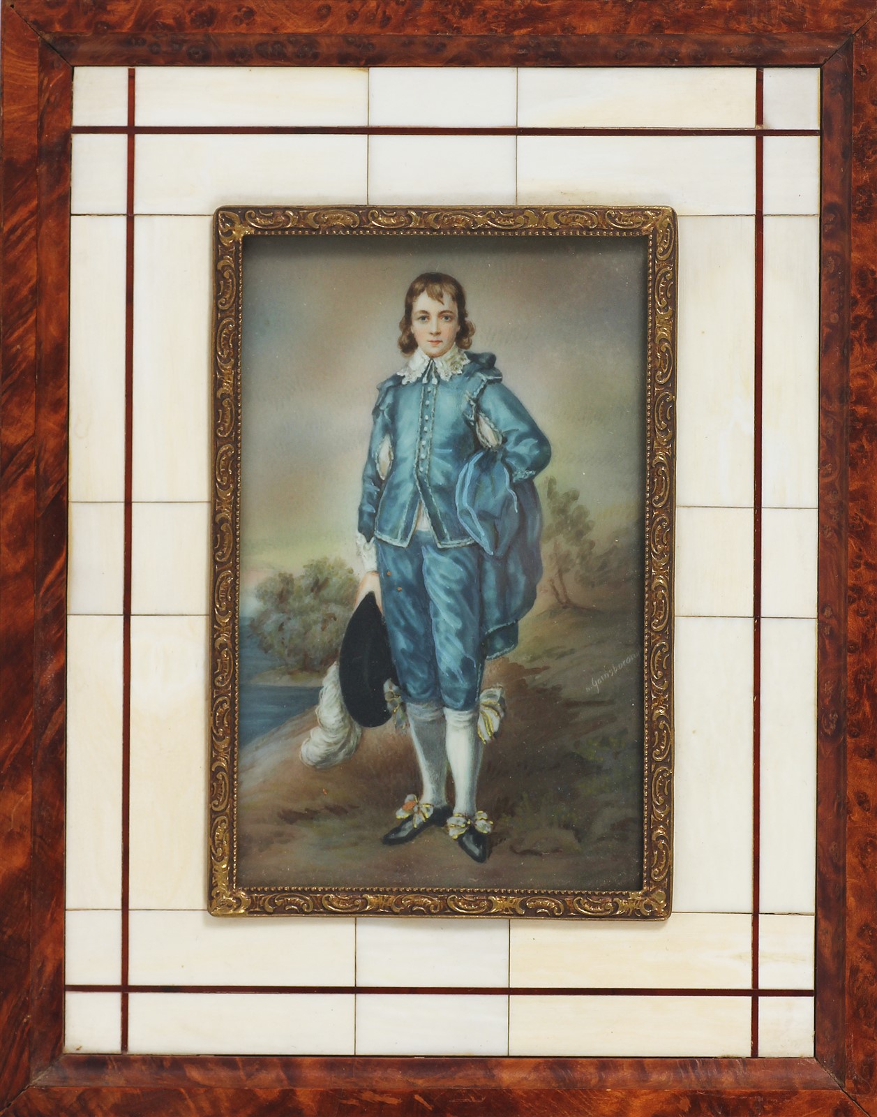 ARTISTA INGLESE DEL XIX SECOLO Ritratto di gentiluomo. Olio su avorio. Cm 7,00 x 12,00. In elegante cornice in legno e osso. Firmato Gainsborough in basso a destra. Cornice presente