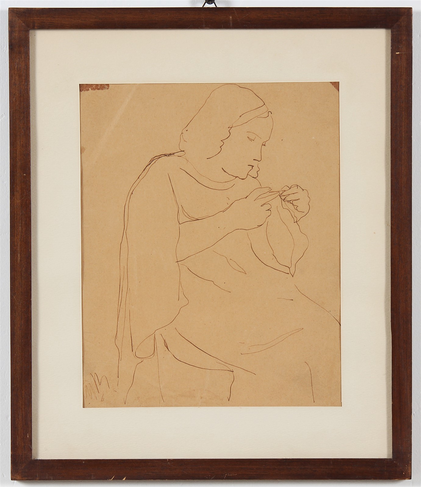 MUSITELLI GIULIO VITO (1901 - 1990) Donna che cuce. Penna su carta. Cm 20,00 x 25,00. Firma in basso a sinistra. Cornice presente