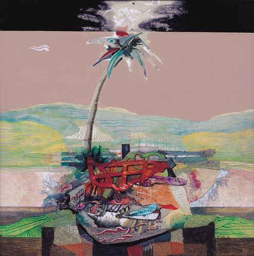 MARIO CESTARI Venezia 1943 Viaggi e transiti 2, 1999 olio e tecnica mista su tavola cm. 50,5x50,6; firma e anno in basso a destra, etichetta dell'artista e timbri della Galleria San Lorenzo (Duomo di Mestre) al retro.