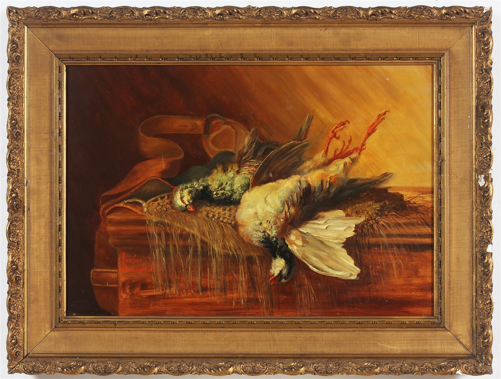 BERNARD JULIE Lotto composto da n. 2 opere. Natura morta. Cacciagione. Olio su tela . Cm 55,00 x 38,00. Entrambe le opere sono firmate in basso. Cornice presente