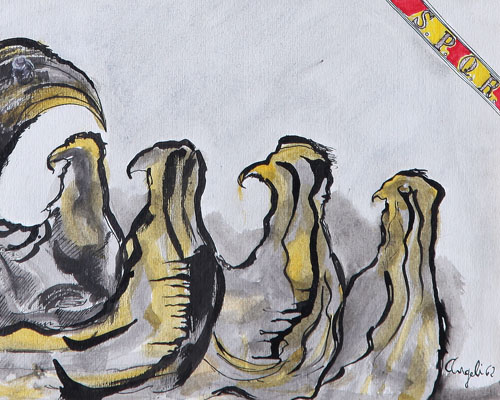 FRANCO ANGELI Roma 14/05/1935 - Roma 12/11/1988 S.P.Q.R., 1962 tecnica mista su carta cm. 18x22,5; firma e anno in basso a destra.