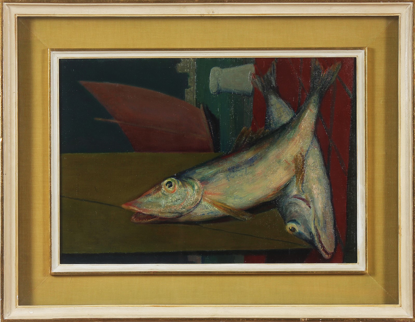 MUSITELLI GIULIO VITO (1901 - 1990) Pesci. Olio su faesite. Cm 35,00 x 50,00. Firam in basso a sinistra. Cornice presente