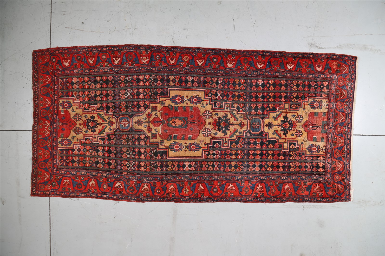 KELLEY MALAYER Tappeto orientale. Persia. 1880. Lana e cotone. Cm 164,00 x 341,00. Fondo blu, bordo rosso. Il tappeto è consumato.