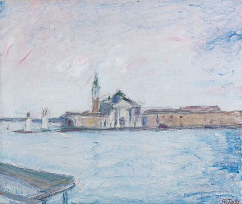 ARTURO TOSI Busto Arsizio (Va) 25/08/1871 - Milano 03/01/1956 Isola di San Giorgio, 1949 olio su tela cm. 50x60, firma in basso a destra, timbri della Galleria R. Rotta (GE) al retro, opera registrata presso l'Archivio Arturo Tosi come da dichiarazione su foto.