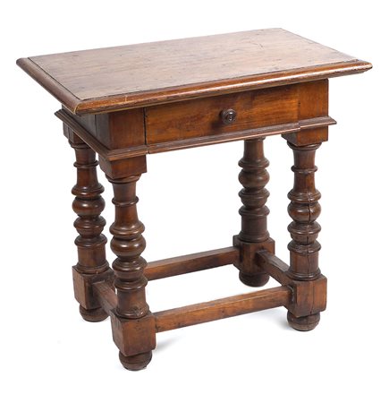 PICCOLO TAVOLO IN NOCE Bologna, fine XVII Sec. piano rettangolare con un cassetto sottostante poggiante su gambe a rocchetto. Il mobile presente restauri e rifacimenti di epoche successive AN ITALIAN WALNUT TABLE Bologna, late 17th century Rectangular top, one drawer, on bobbin turned legs. Restorations from a later period. 62x64x42 cm.