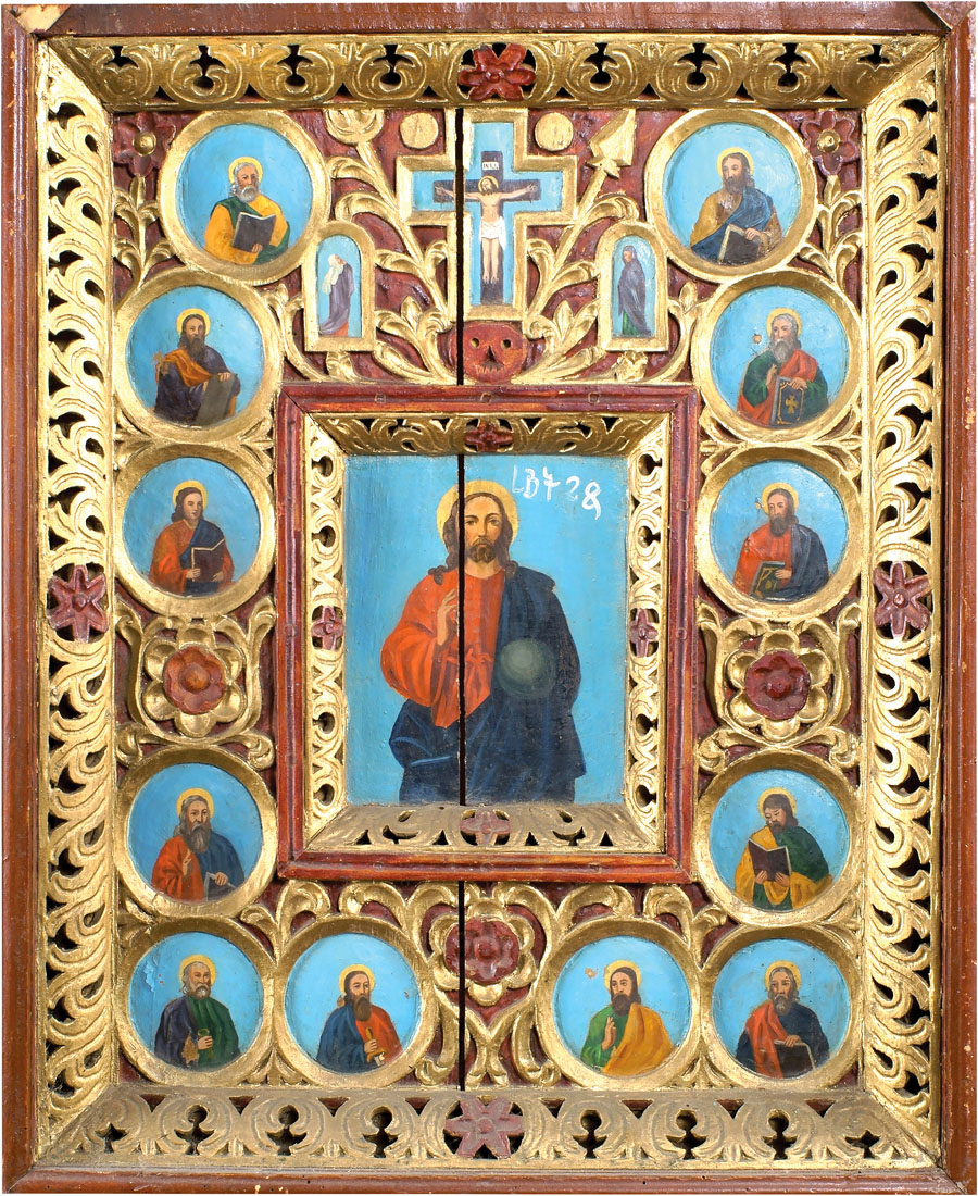 SCUOLA TEDESCA XIX Sec. "Gesu' con i 12 apostoli", olio su tavola con elementi laccati e dorati GERMAN SCHOOL 19th century "Jesus and the 12 apostles", oil on canvas with gilt applications and lacquered elements 67x54 cm.