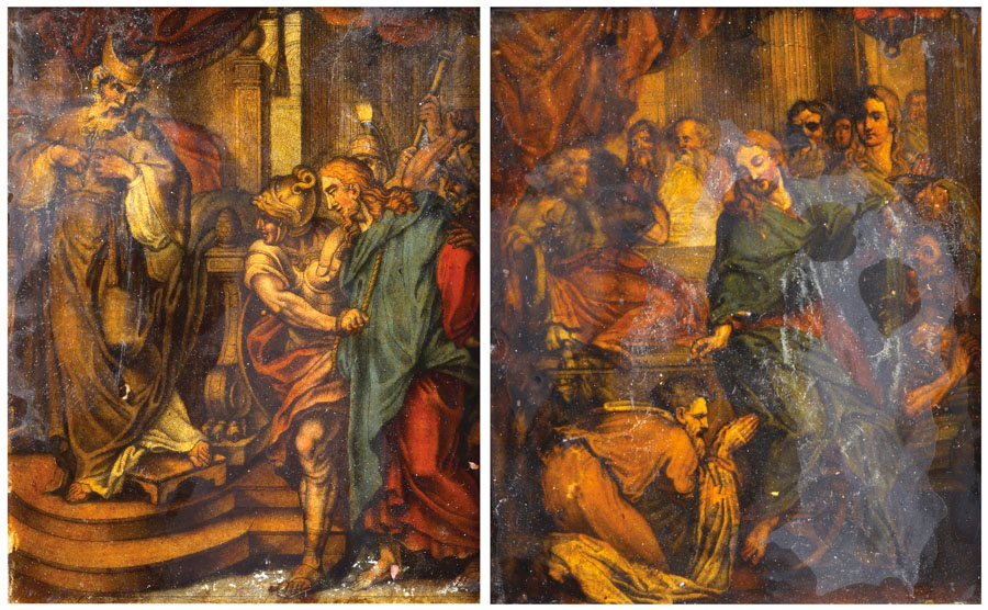 SCUOLA ITALIANA XIX Sec. "Scene dalla passione di Cristo", coppia di dipinti sottovetro, entro cornici ITALIAN SCHOOL 19th century "Passion of Christ", pair of framed reverse glass paintings 24x18 cm.
