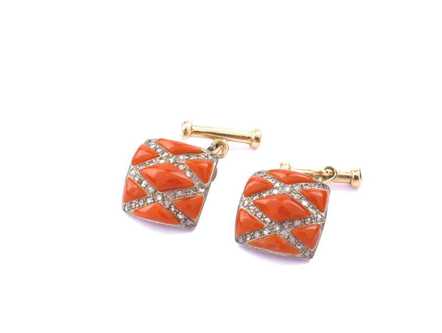 GEMELLI IN ORO GIALLO 14KT E CORALLO MEDITERRANEO di colore rosso alternato a rose di diamante 14KT GOLD AND MEDITERRANEAN CORAL CUFF LINKS Red coral surrounded by rose-cut diamonds peso 6,4 gr.