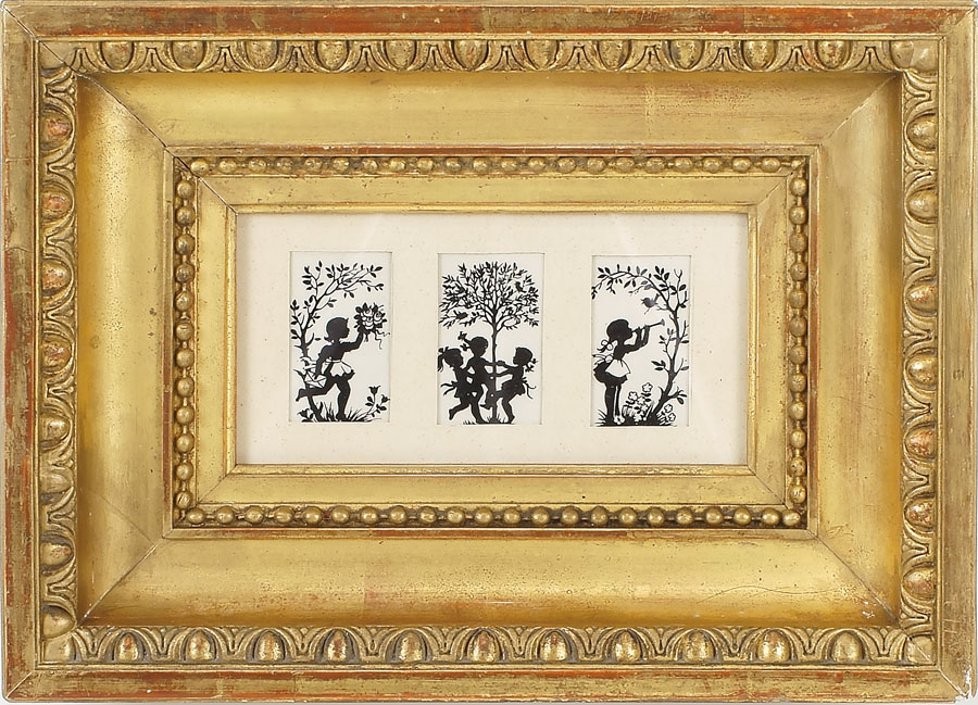 SILHOUETTE IN MONOCROMIA raffigurante giochi di bimbi, entro cornice in legno dorato A MONOCHROMATIC SILHOUTTE shaped like playing kids, with giltwood frame 7,5x15,5 cm.