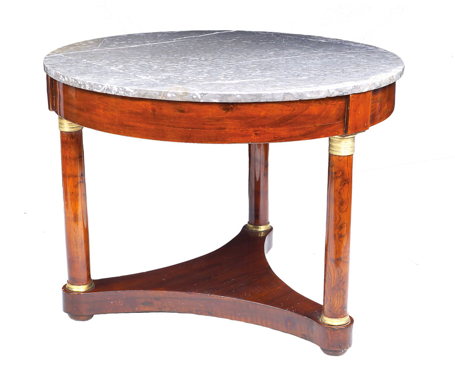 TAVOLO DA CENTRO IMPERO Francia, XIX Sec. in mogano, piano circolare in marmo grigio e fascia sottostante sorretti da tre colonne tornite con basi e capitelli in bronzo dorato e cesellato, poggianti su base a tripode A FRENCH MAHOGANY EMPIRE STYLE CENTRE TABLE 19th century Marble top on three turned legs joined by a triangular concaved tier with ormolu applications 74x98 cm.