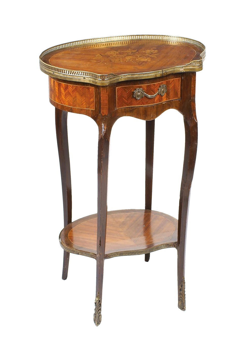 TAVOLINO INTARSIATO IN BOIS DE ROSE E PALISSANDRO Francia, XX Sec. piano sagomato con ringhierina in bronzo e un tiretto sottostante, gambe di linea mossa, difetti A FRENCH BOIS DE ROSE AND PALISANDER MARQUETRY TABLE 20th century Bronze applications, defects 73x46x36 cm.