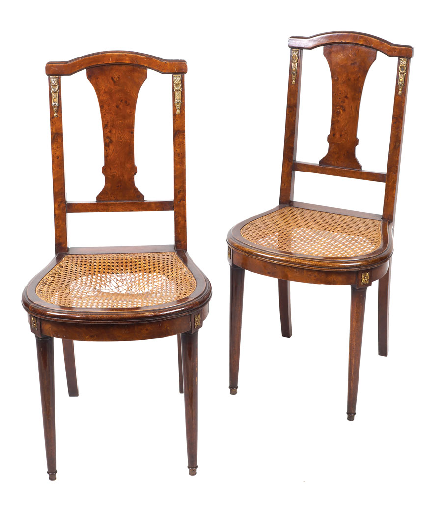 COPPIA DI SEDIE IN MOGANO E RADICA fine XIX Sec. applicazioni in bronzo dorato, schienale traforato, seduta in paglia di Vienna, difetti A PAIR OF MAHOGANY CHAIRS late 19th century With ormolu applications, woven rattan seating, defects 93x41x43 cm.