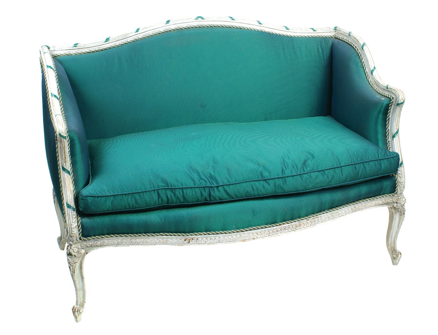DIVANETTO IN LEGNO LACCATO Francia, XIX Sec. seduta e schienale rivestiti ed imbottiti in tessuto A FRENCH LACQUERED WOODEN SOFA 19th century Upholstered in green fabric 89x120x58 cm.