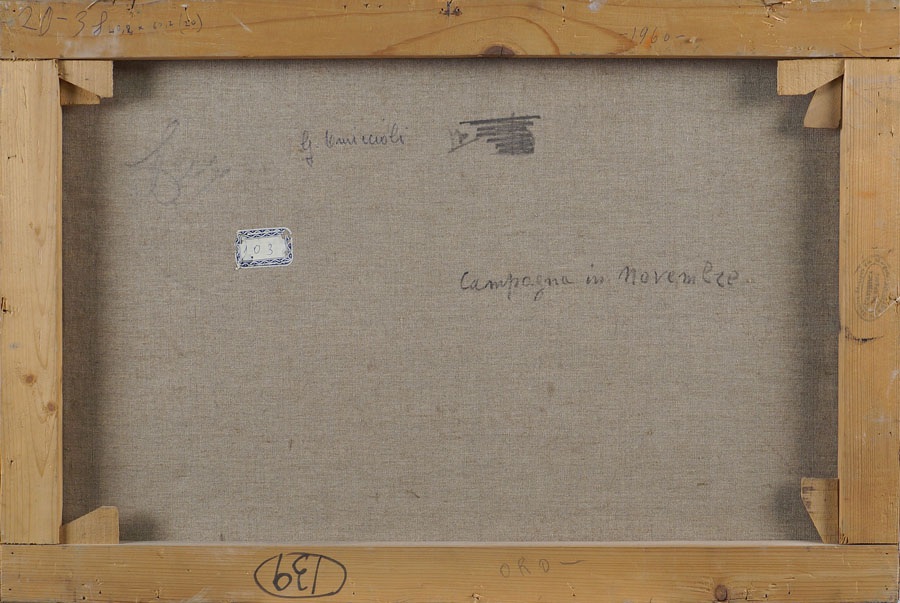 GIOVANNI OMICCIOLI Roma 1901 - 1975 "Campagna in Novembre", olio su tela, firmato in basso a sinistra, sul retro titolo e firma, entro cornice GIOVANNI OMICCIOLI Rome 1901 - 1975 "On the countryside in November", oil on canvas, signed (lower left and on the reverse), also titel on the reverse, framed 40x60 cm.